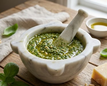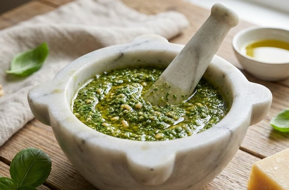 Il pesto alla genovese è una delle salse italiane più rappresentative in assoluto. Profumato, intenso e cremoso, nasce dall’unione di basilico fresco, olio extravergine, pinoli e formaggi. La versione autentica prevede la preparazione al mortaio, che permette di ottenere una consistenza vellutata e un aroma più complesso rispetto al frullatore.